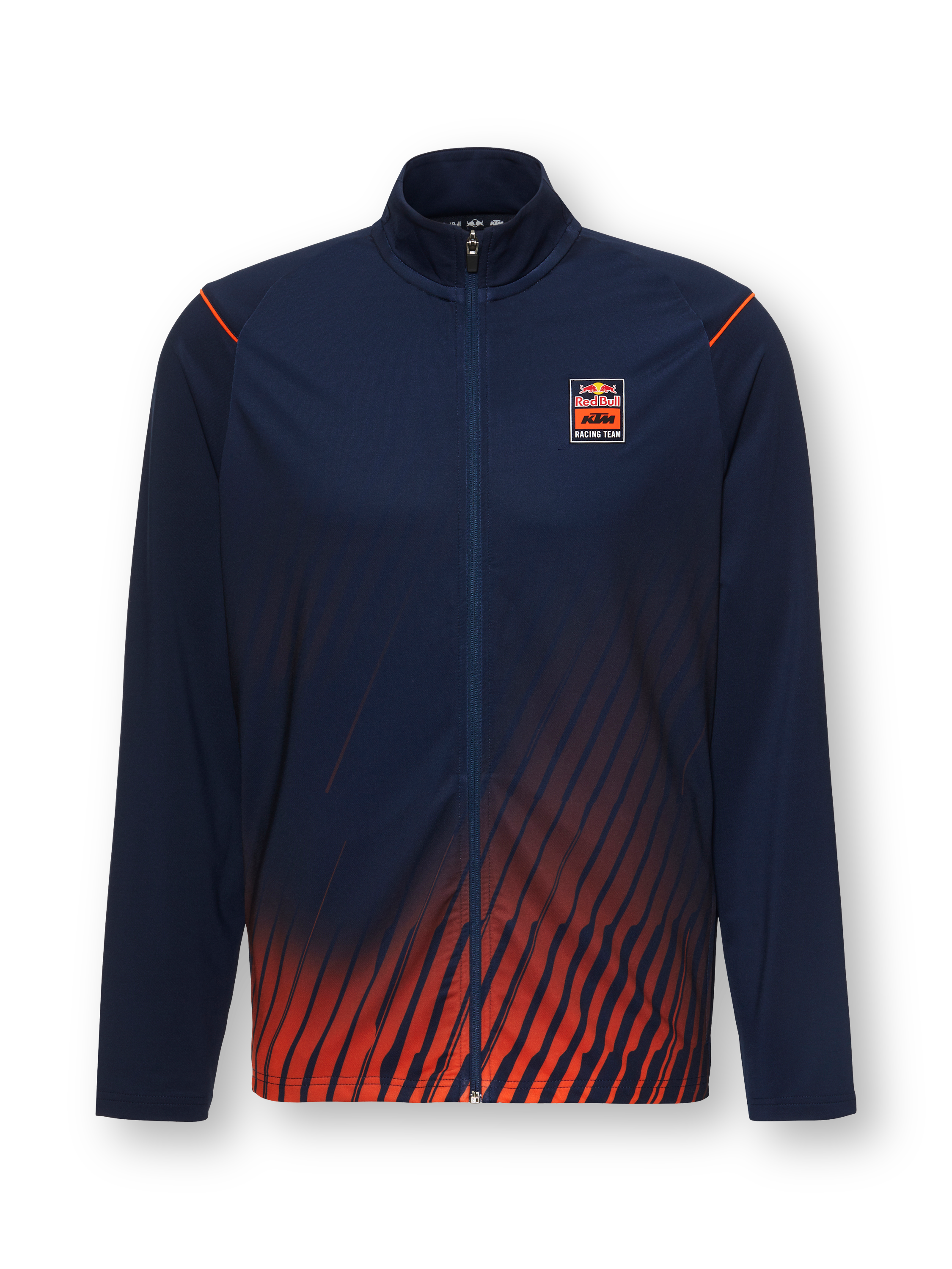 Sportovní větrovka KTM Red Bull Racing z nejnovější volnočasové kolekce. Větrovka KTM doplněná oranžovými prvky a logem KTM Red Bull Racing.