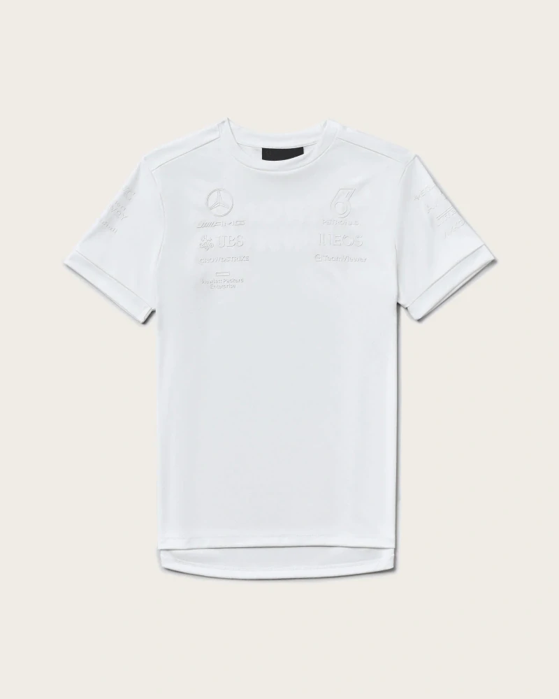 Luxusní týmové tričko Mercedes AMG Petronas F1 v bílém Stealth provedení. Bílé týmové tričko Mercedes Formule 1 doplněné týmovými logy v 3D provedení stejné barvy. Vynikněte z davu s tímto novým týmovým tričkem Mercedes AMG Formule 1.