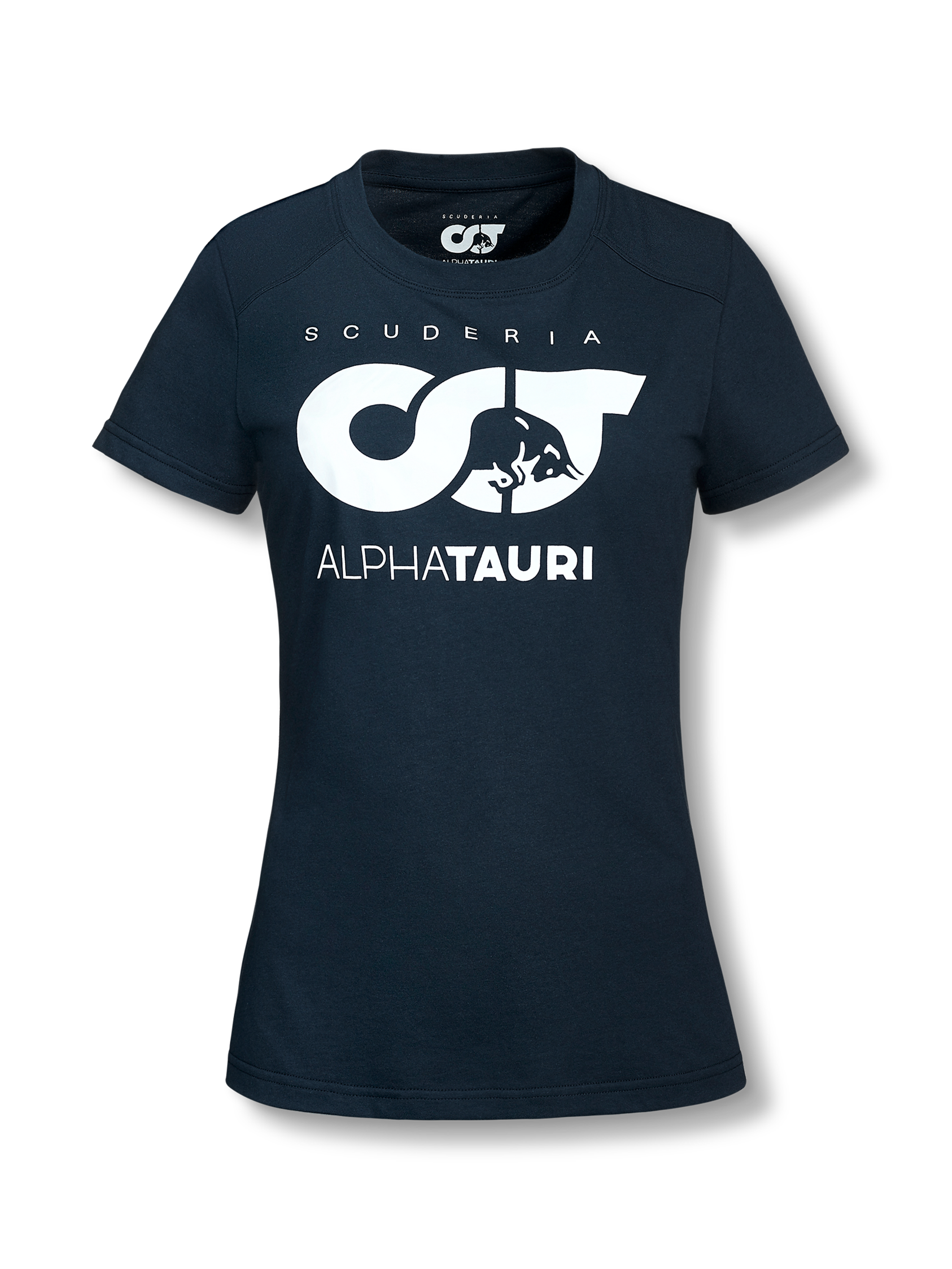 Bavlněné dámské tričko Scuderia Alpha Tauri pro každodenní příležitost. Modré provedení doplněné velkým potiskem na přední straně. Dámské tričko Alpha Tauri Formule 1.