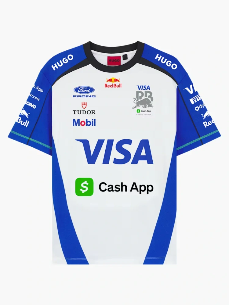 Zcela nové týmové tričko týmu Formule 1 Visa Cash App RB s prvky Ford Racing. Bílá barva doplněná luxusním potiskem Red Bull a logy sponzorů.